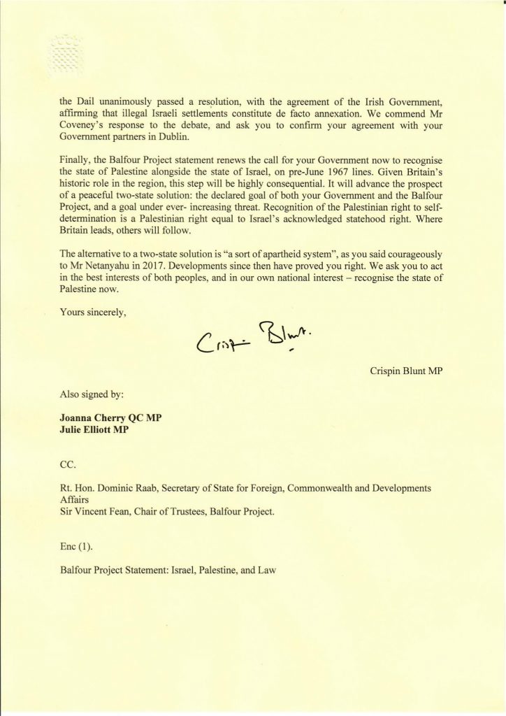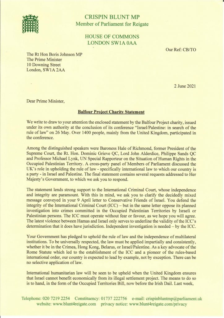 MPs send No.10 the Balfour Project call for the strict application of international law, including via the ICC, in the Occupied Palestinian Territory.