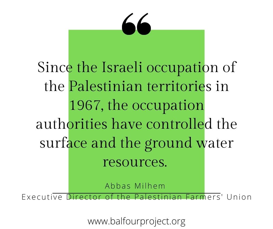 Now this is not the only catastrophe Palestinians are facing in terms of shrinking of agriculture and shrinking of land and annexation of land, but also there’s annexation of water resources and control over water resources. Since the Israeli occupation of the Palestinian territories in 1967, the occupation authorities have controlled the surface and the ground water resources.