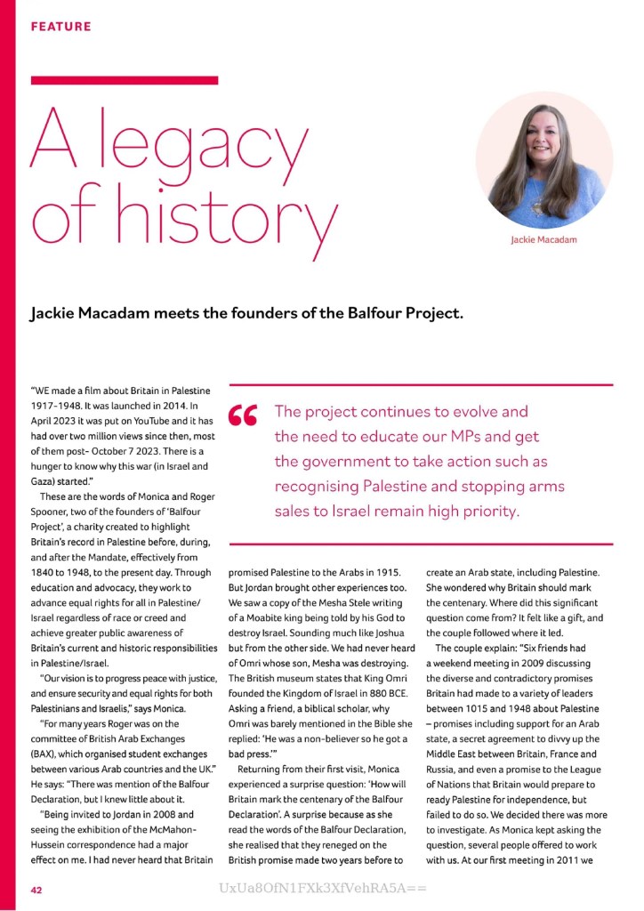 In this article, in Life and Work, the monthly magazine of the Church of Scotland, Jackie Macadam interviews Monica Spooner and her husband Roger, founders of the Balfour Project (now the Britain Palestine Project), about their discovery of the Balfour Declaration and its consequent injustices for the Palestinians; and about Monica’s book about it all Why Didn’t I Know?, in which she relates how her faith helped her battle on against Britain’s “colonial deceit” in the Holy Land.