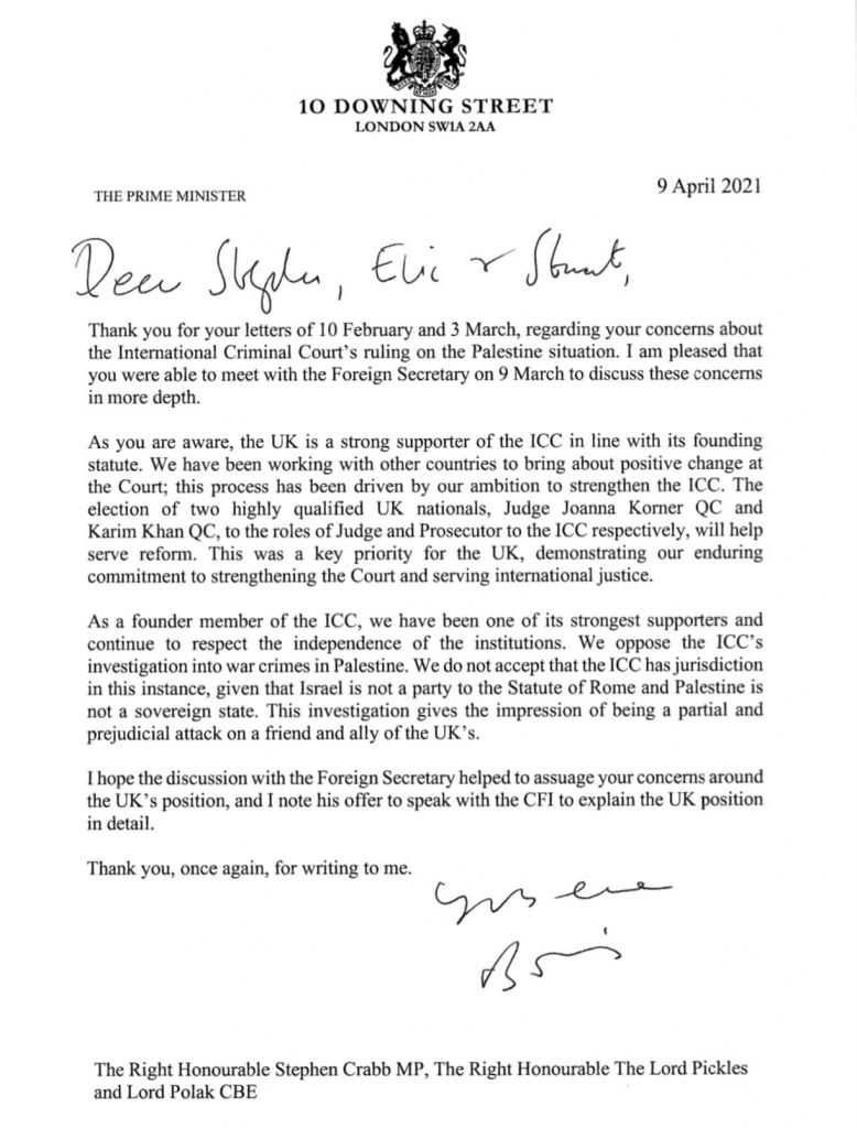 The announcement by UK Prime Minister Boris Johnson in a letter to the Conservative Friends of Israel that the UK opposes the International Criminal Court (ICC) investigation into war crimes by Israel is deeply regrettable.