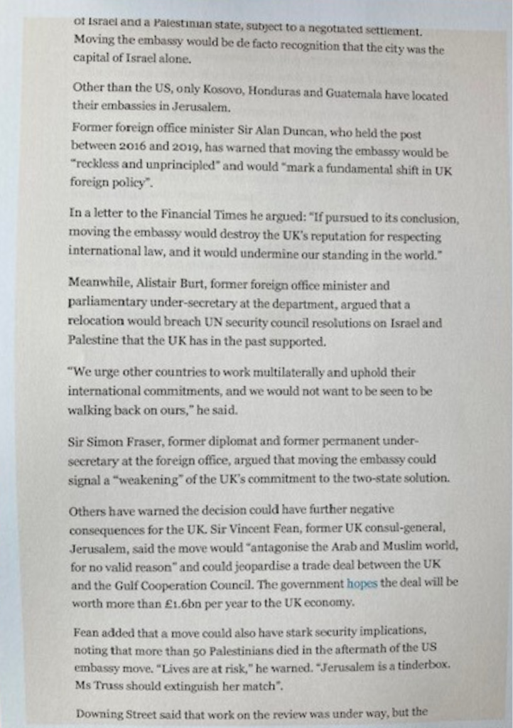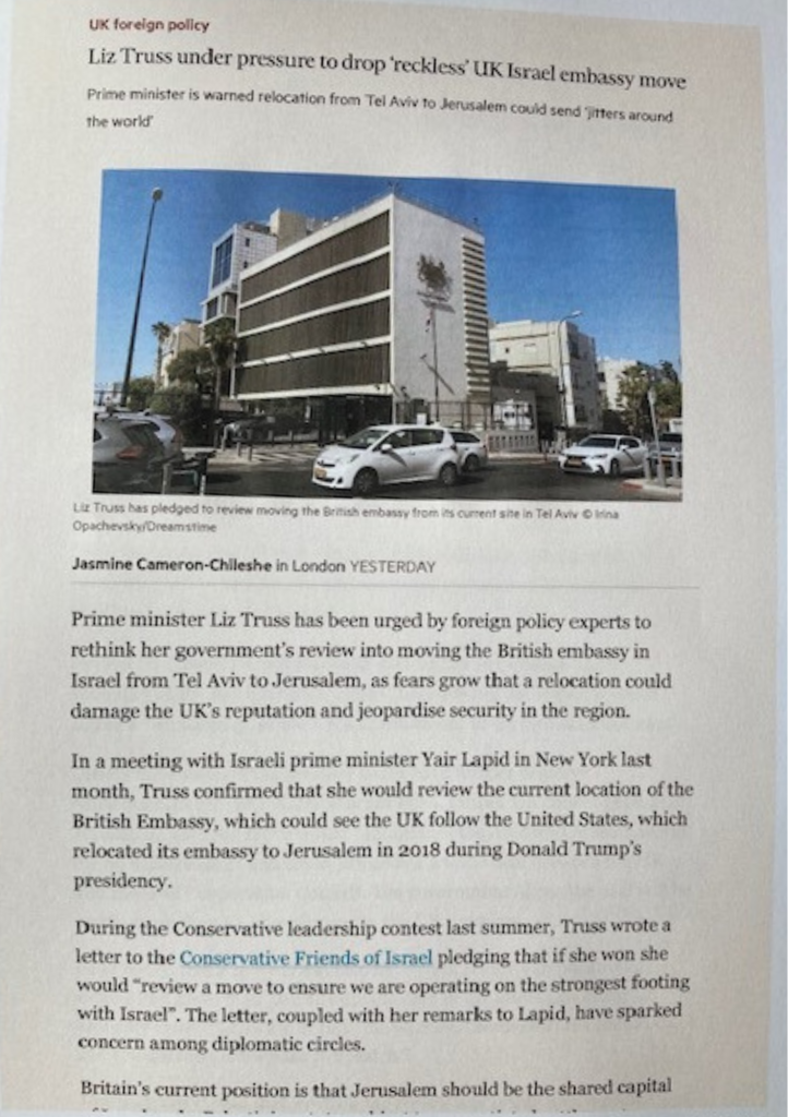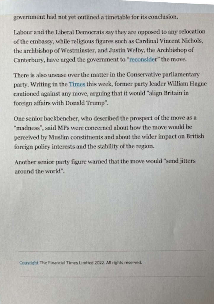 The Financial Times, with its long record of incisive Middle East reporting and careful editorial judgment, has added its voice to those urging the British Prime Minister to reconsider her stated inclination to review the question of whether the British mission to Israel should be moved to Jerusalem.