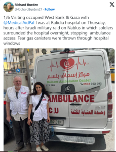 The Nablus hospital I visited last year had not only been surrounded by Israeli troops. Ambulances had been prevented from getting to the hospital and tear gas had been thrown through hospital windows. Targeting hospitals and other health facilities is contrary to international humanitarian law. There are again reports of ambulances being blocked from reaching the wounded during this week’s attacks, together with the main hospital in Jenin being cut off by Israeli forces. Nablus is one of the towns again under attack this year and my thoughts turn to the doctors, nurses and other staff I met last year.