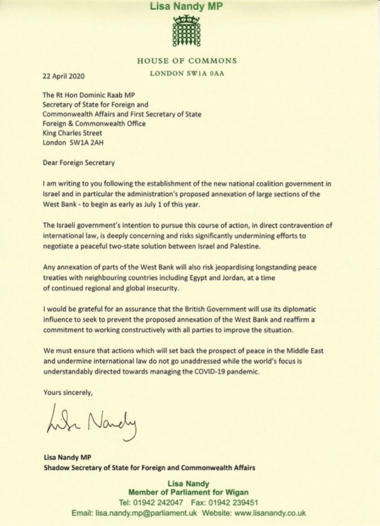 This is a letter from Lisa Nandy MP, Shadow Secretary of State for Foreign and Commonwealth Affairs, to the Rt Hon Dominic Raab, Secretary of State for Foreign and Commonwealth Affairs and First Secretary of State
