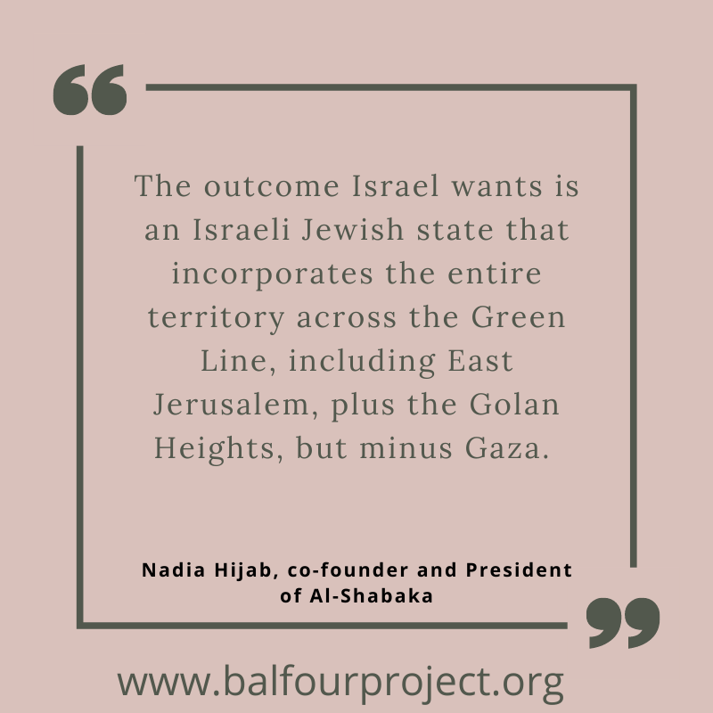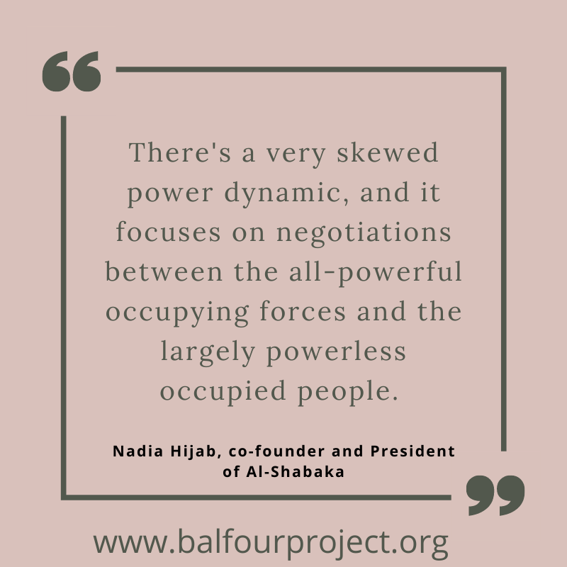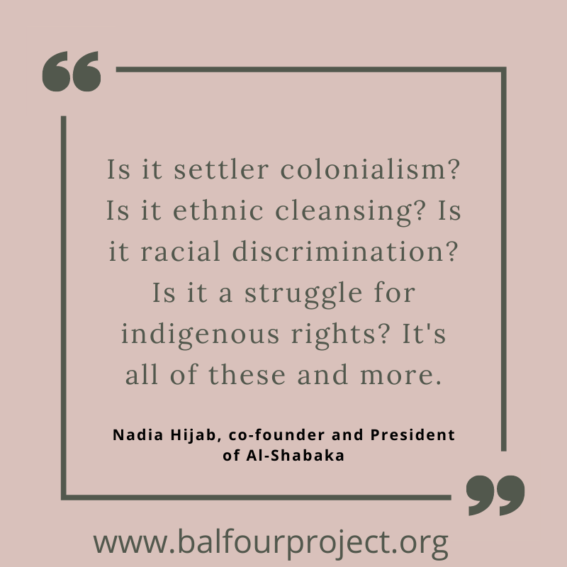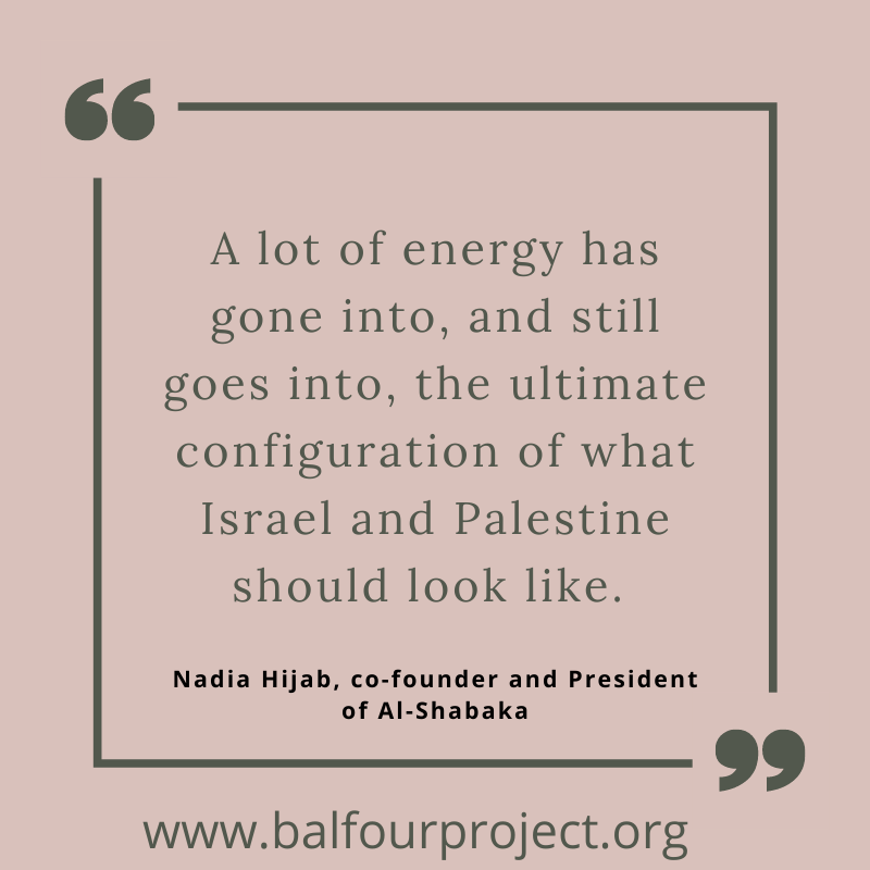 I think that it is, in my own personal opinion, very, very important to get the Palestinian voices out there. So I’m so pleased on behalf of the Balfour Project that we’ve managed to secure you for this talk for this reason; to hear such an interesting and important perspective.