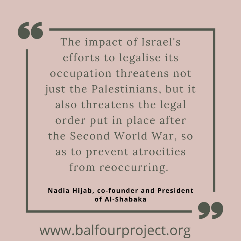 It’s worth noting, also, that the impact of Israel’s efforts to legalise its occupation threatens not just the Palestinians, but it also threatens the legal order put in place after the Second World War, so as to prevent atrocities from reoccurring. This is something we all have to fight for to uphold the system of international law. International law is undermined when Boris Johnson opposes the International Criminal Court’s investigation into crimes in Palestine as a prejudicial attack on Israel and when Keir Starmer reprimands Stephen Kinnock MP’s recent plea to uphold international law with regards to settlements. If we don’t have international law, really, we have nothing.