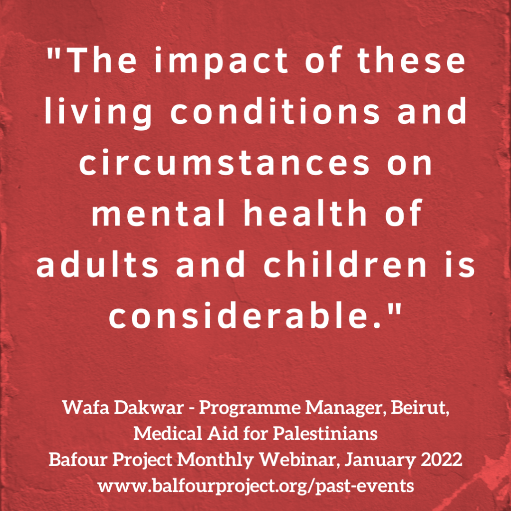 I’m sure many of you know about Medical Aid for Palestinians and what we do. The name, I guess makes it fairly obvious, but we are a health and development charity. We work in local partnerships through our offices in the West Bank, Gaza, Lebanon, and the UK. Our programmatic focuses that Wafa will speak a little bit more on in a bit, are women and children’s health, mental health, and psychosocial support, disability and emergencies and complex hospital care. And obviously during the COVID-19 pandemic, an emergency response has been a significant part of our work, but we also have an advocacy and campaigns arm, a team of four of which I’m one quarter, that works both in public advocacy and campaigning and private advocacy with MPs and governments and others to try and highlight and draw attention to the political, social and economic barriers to Palestinians’ rights to health and dignity and try and promote policy actions that may address those.