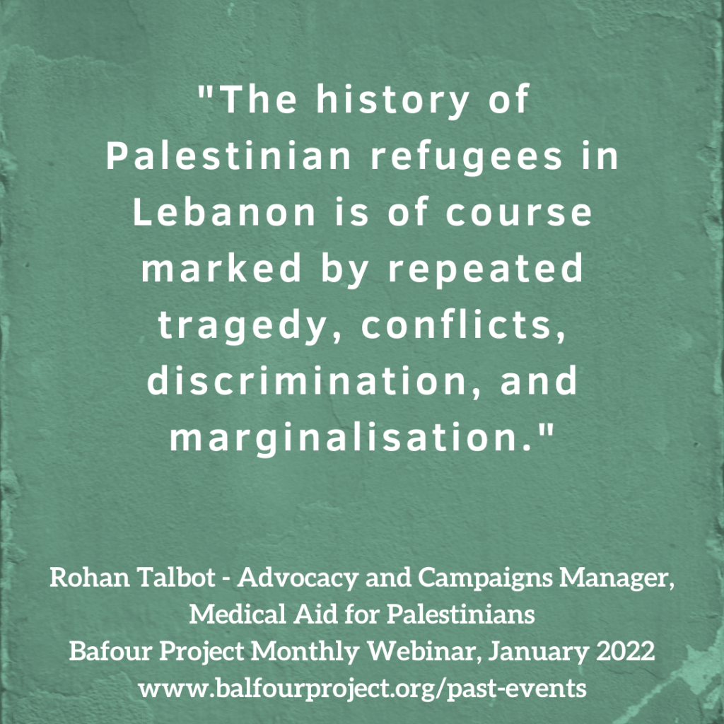 The history of Palestinian refugees in Lebanon is of course marked by repeated tragedy, conflicts, discrimination, and marginalisation. There’s been a host of different marks in history, including the Lebanese civil war, the massacres in Tel al-Zaatar 1976 and Sabra and Shatila in 1982, the war of the camps and the siege of [inaudible 00:04:30] in 1984, the [inaudible 00:04:34] conflict of 2007 and of course, since 2011, there’s also been an influx of double displaced refugees from areas such as Yarmouk, Daraa and Ayn al Talv from the civil war in Syria.