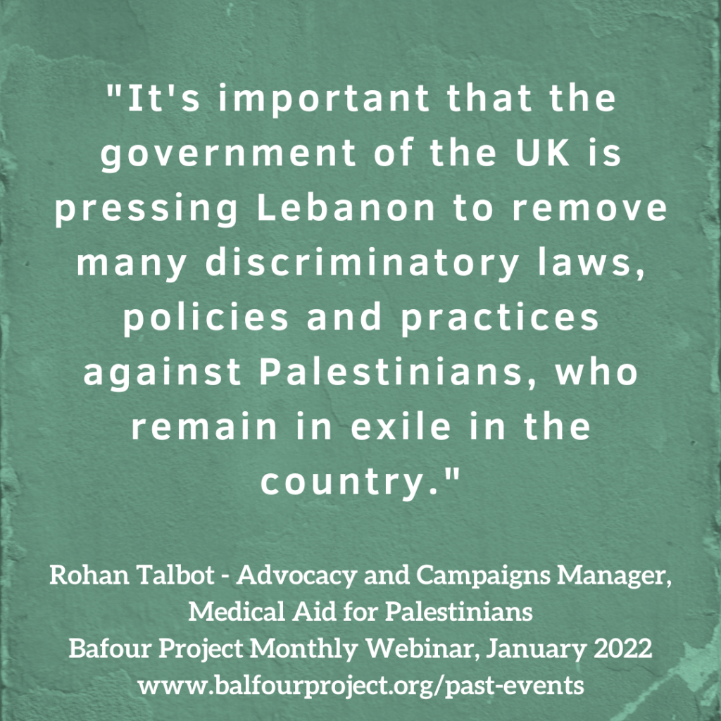 So, I will get started with questions so we can get through as many as possible. From Magan Singodia, who is on the executive committee and board of the Balfour Project, his question is, “What rights do the Palestinian refugees have in Lebanon versus Lebanese citizens themselves?”