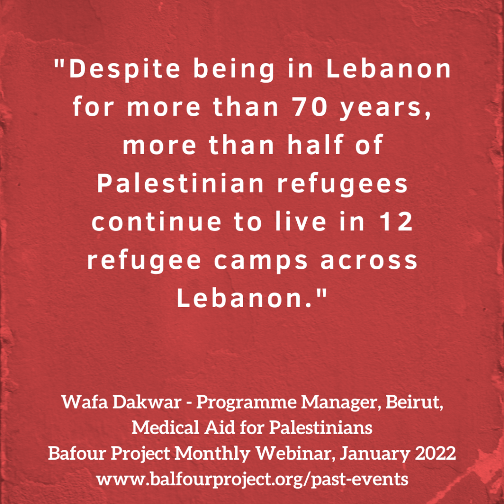 Hi everyone. I’m Wafa Dakwar, Programme Manager of MAP in Lebanon. I’m also a Palestinian refugee. So, I’m going to talk about the context of the Palestinian camps, the current crisis and MAP’s response. Despite being in Lebanon for more than 70 years, more than half of Palestinian refugees continue to live in 12 refugee camps across Lebanon. These camps have dire conditions.