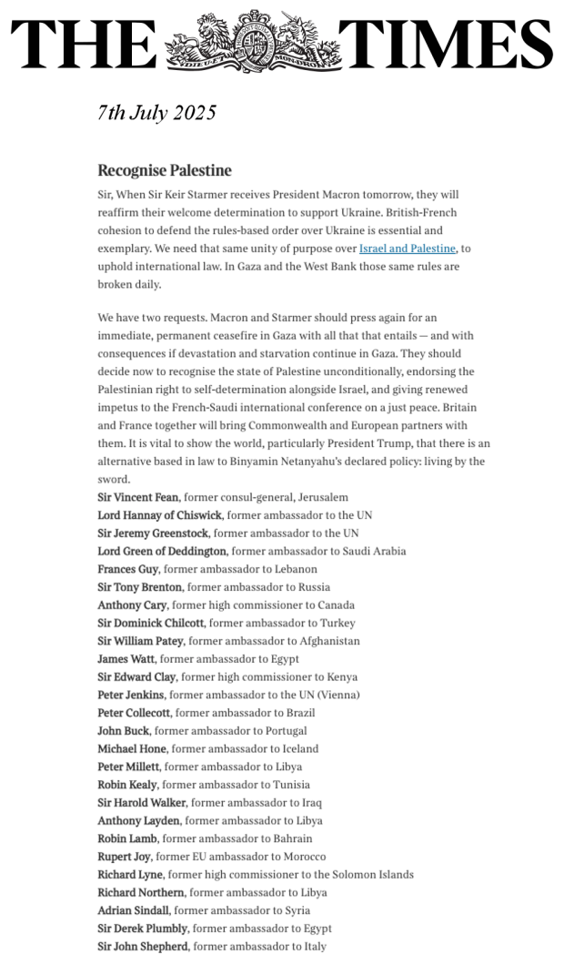 Letter from Sir Vincent Fean and 25 other former British Diplomats urging Prime Minister Starmer and President Macron to push for an immediate ceasefire in Gaza and to unconditionally recognise the state of Palestine, affirming international law and offering a peaceful alternative to Netanyahu’s policies.