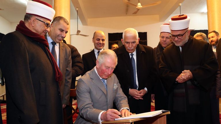 The Prince of Wales visits the Mosque of Omar and signs the visitor book