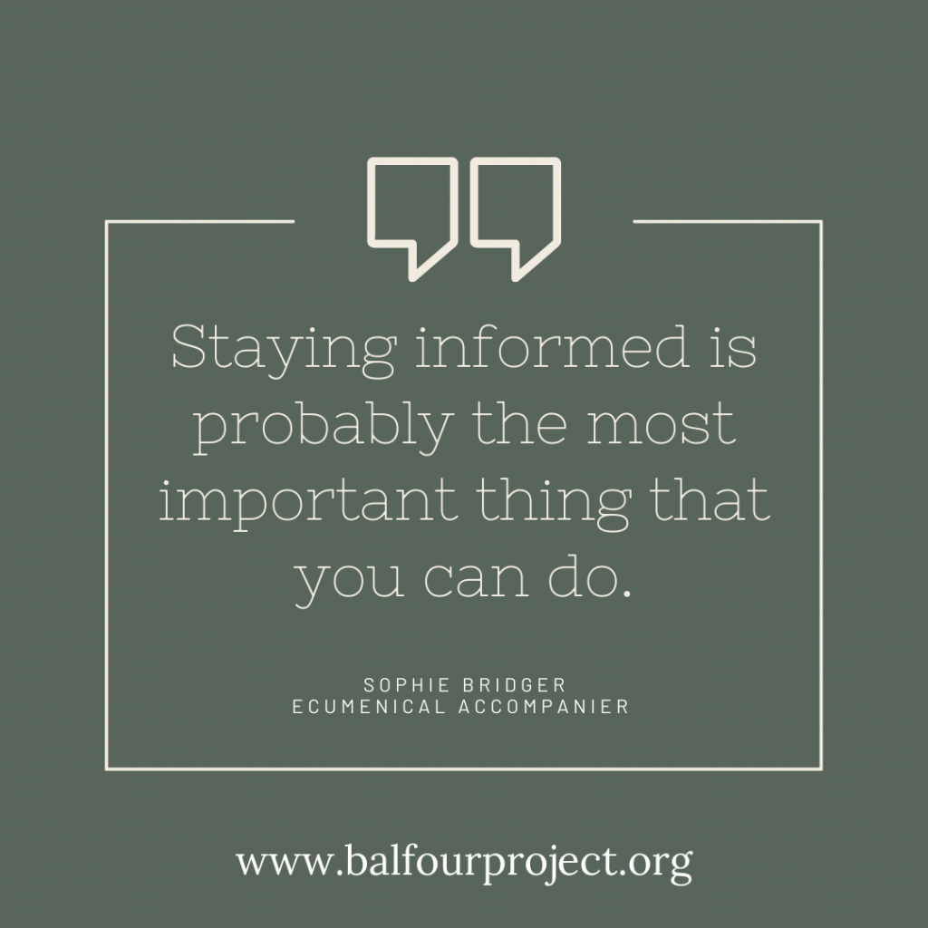 But keeping yourself informed is the best way to start that journey of taking action. Share what you know with others. And when you see circumstances, for example of military incursions in schools, email your MP, ask them to raise it with the foreign office, because that does make a difference. It starts to chip away at what the Israeli state is doing. You can ask them to raise this in general, or you can ask them to raise it when you see specific instances of the military attacking schools.