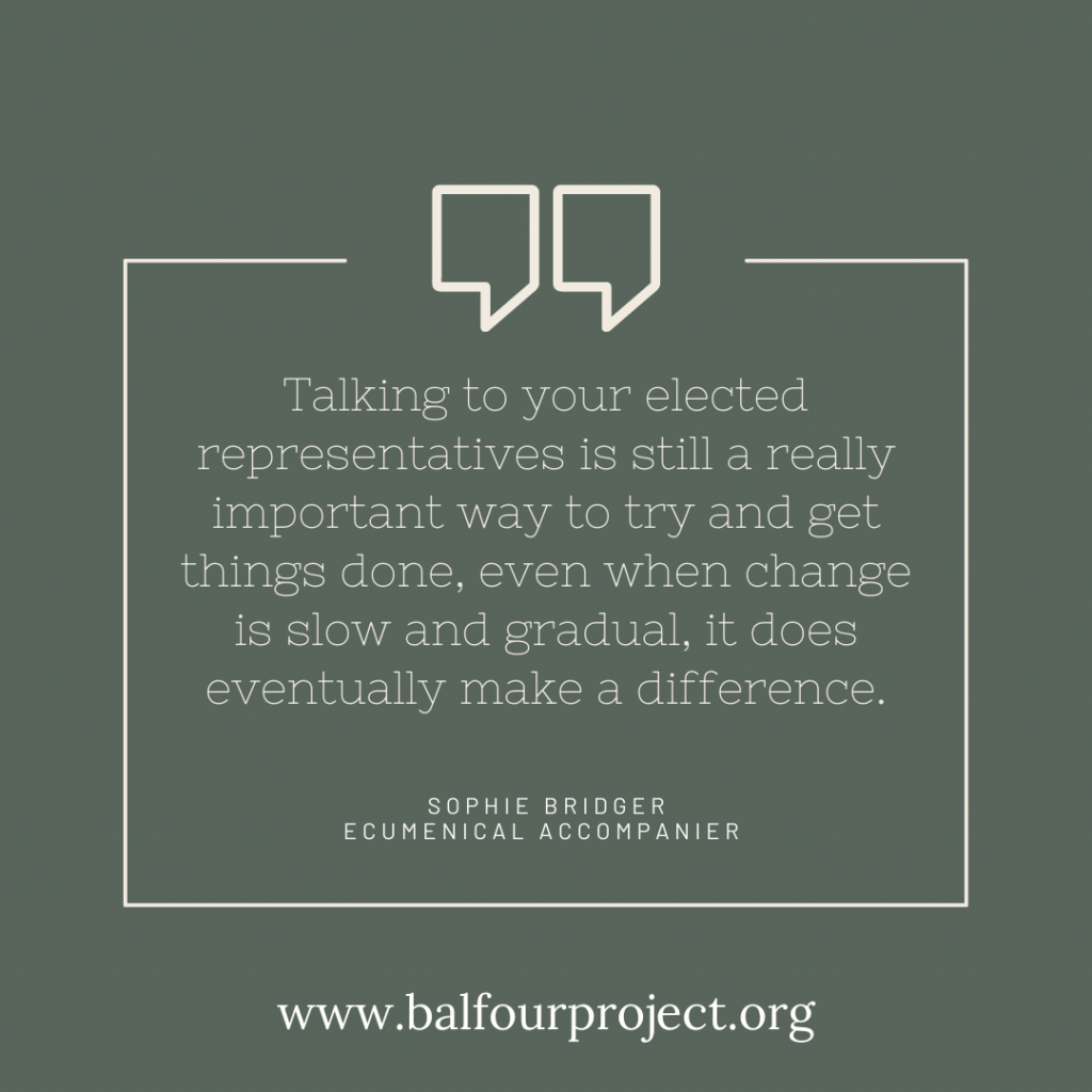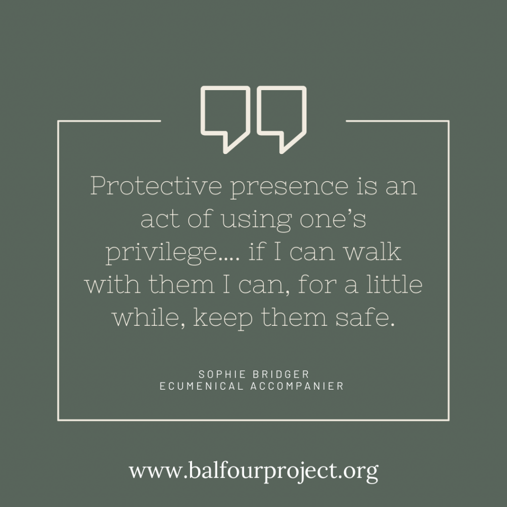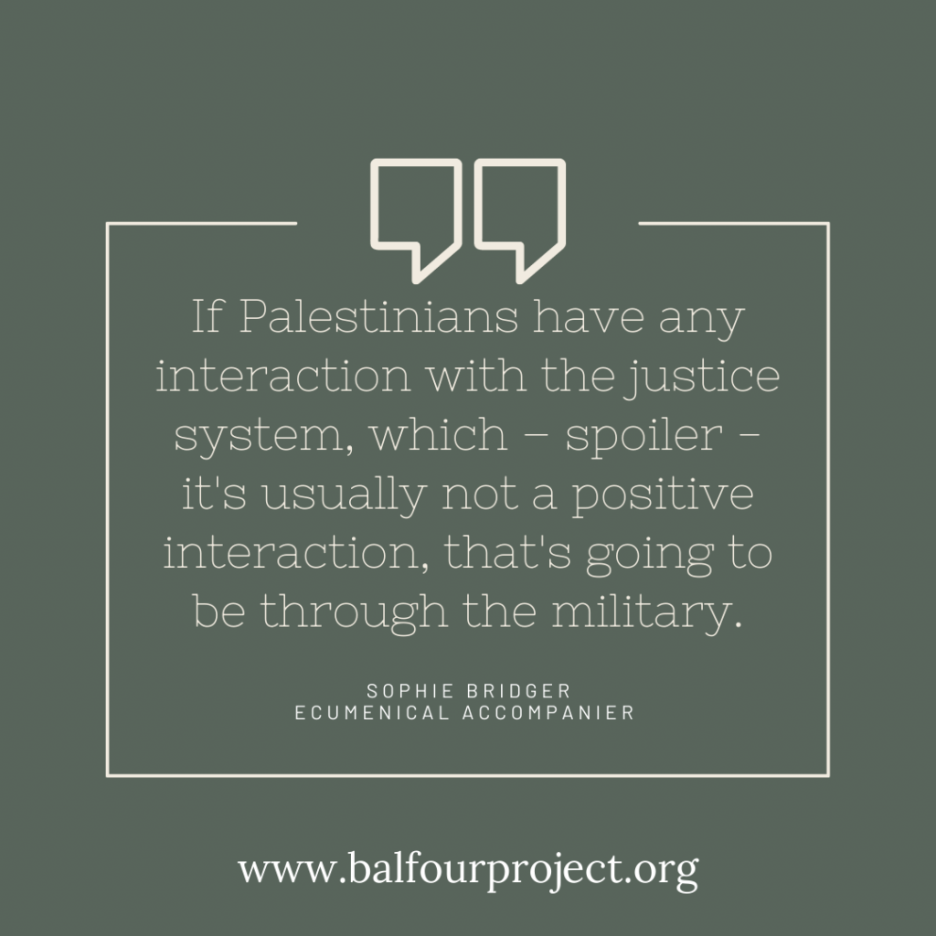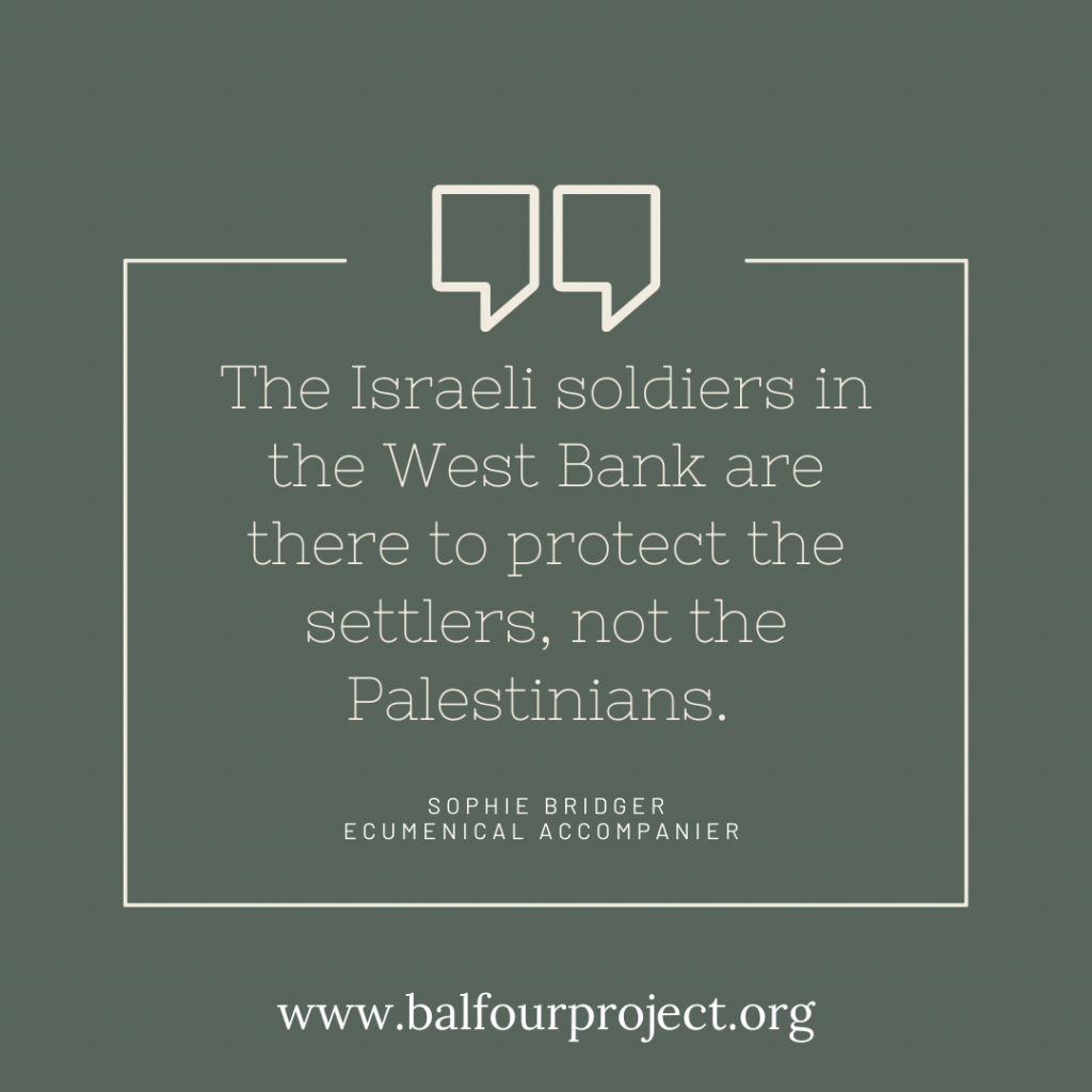 Thank you so much for inviting me. And thank you to the Balfour Project for hosting us. It’s a real privilege. My name is Sophie and I spent three months in Palestine and Israel end of 2018 til about January 20219. I think it’s pretty important to talk about the circumstances that basically led me to be in Palestine and Israel, because I think that very much changes the sort of lens that people will talk about the region, what we saw that for example.