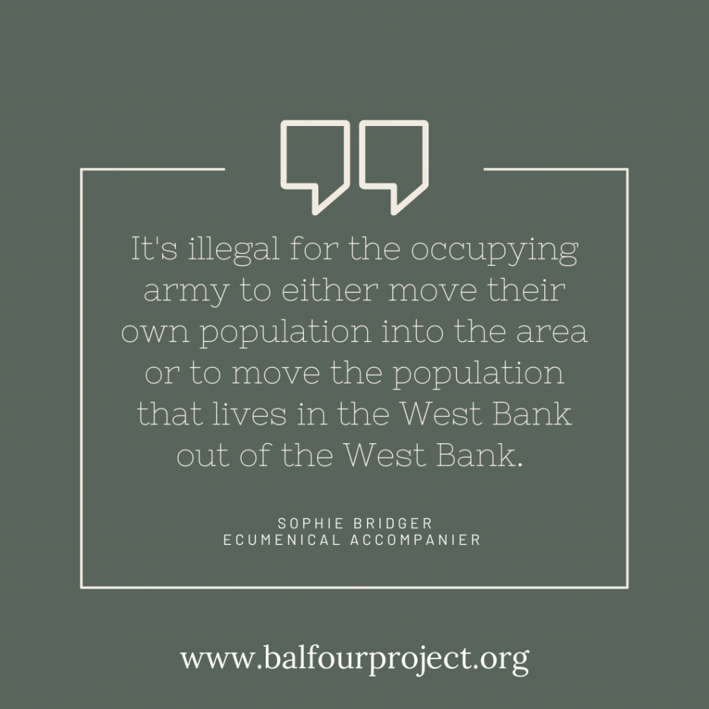 So they control basically all parts of day-to-day life in Palestine, particularly in the West Bank. So the soldiers see this military tower as a way to monitor what’s going on in the village to help them to control what’s going on. Their concern and the reason that they see for being there is not anything to do with the safety of the Palestinians, it is to do with the safety of the people, living in the houses at the top of the hill. Now this is an Israeli settlements, which has many of you will already know is illegal under international law. It’s illegal for the occupying army to either move their own population into the area or to move the population that lives in the West Bank out of the West Bank.