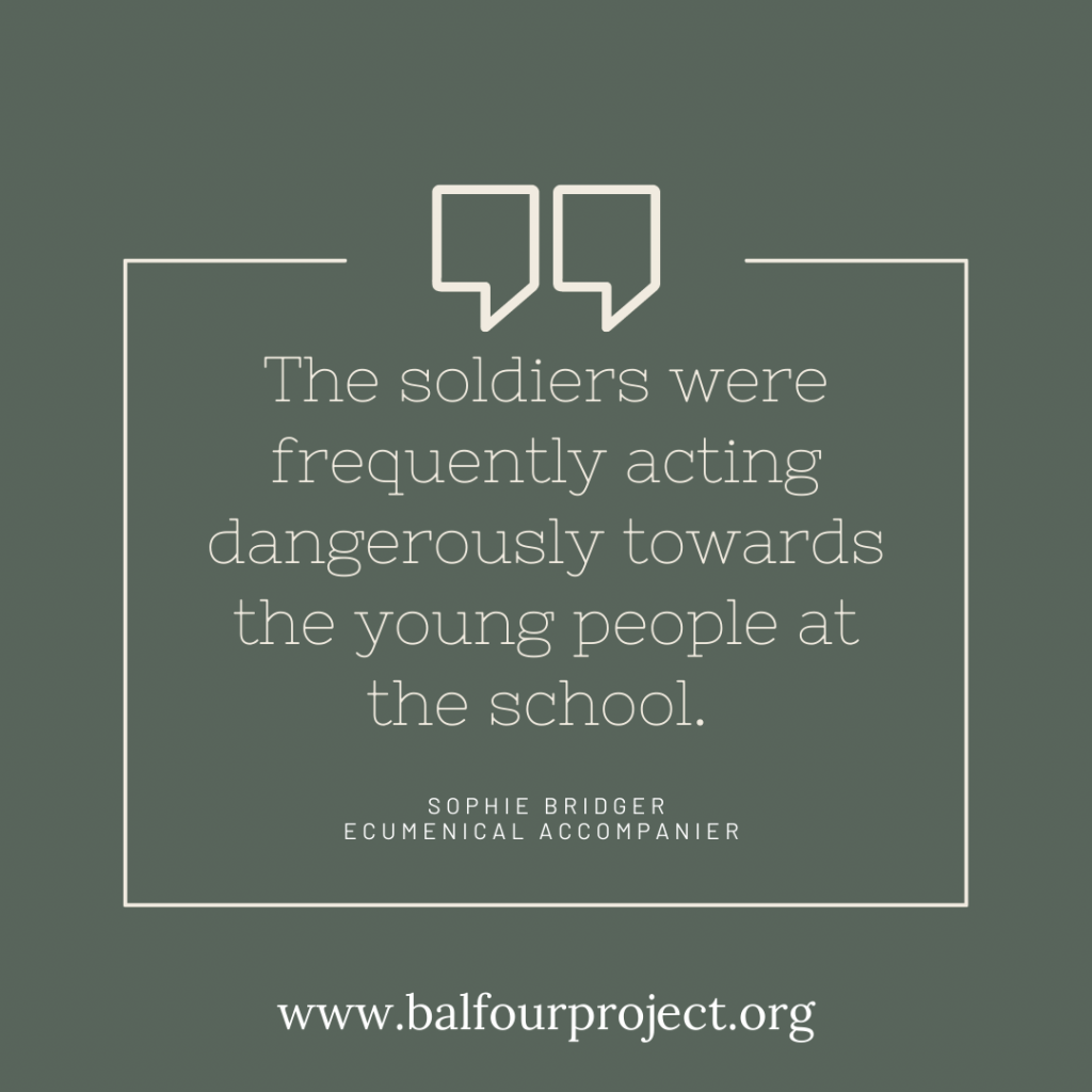 Sometimes they did. We had, for example, a story of a student who was picked up on his way back from school by a member of the IDF who thought he’d seen someone similar looking throwing a stone. We went to go speak to him about what his experience had been afterwards. He told us that he’d been kept for several hours, questioned, and for letting him go, they hit him in the face with the butt of their gun. So this is not academic question of, ‘oh, it’s a bad thing that soldiers are there.’ The soldiers were frequently acting dangerously towards the young people at the school.