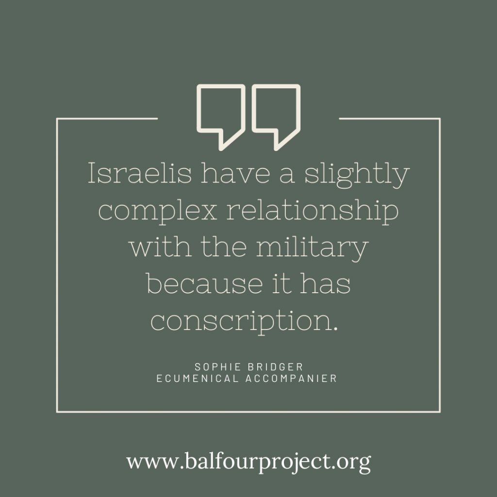 And I think it’s really important to talk about the fact that that actually not all Israelis support the Occupation and not all Israeli support the actions of the Israeli military. Israel has a slightly complex relationship with the military because it has conscription. So every Israeli citizen with a couple of exceptions will go through the Israeli military and their children will go through the Israeli military. That really changes the way that the public sees the actions of Israeli soldiers. Because if you see yourself as a reasonable person and your child as a reasonable person, and you’ve both been in the military and you don’t think that you would behave unreasonably, you wouldn’t do something violent unless there was a very good reason to, then surely those soldiers won’t either. And so that really changes the way that the public looks at these kinds of actions.