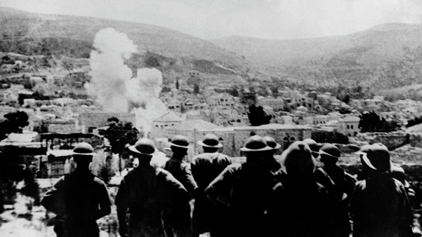 British soldiers look on during blasting operations of the houses of Arab inhabitants of mandate Palestine, circa 1939 (Photo by Heinrich Hoffmann / Deutsche Allgemeine Zeitung / ullstein bild via Getty Images)