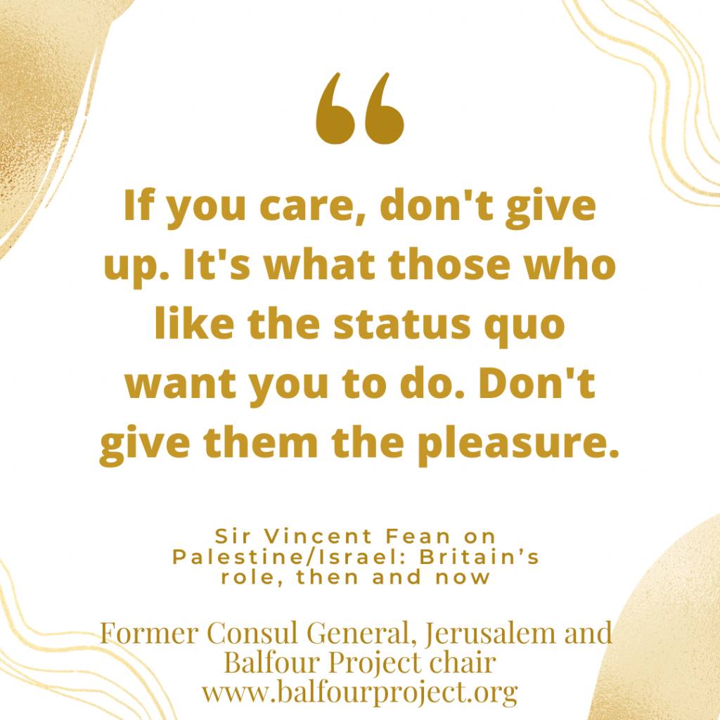 If you are moved or impressed or even interested by what you’ve heard today, and what you see on the website, please think about a donation to the Balfour Project. We live and die by the goodwill of people like you, of our supporters, of our subscribers. With more money we can do more, make more noise, and we can try and make more of a difference educationally and in terms of advocacy. That’s what we want to do, if you’ll help us to do it.