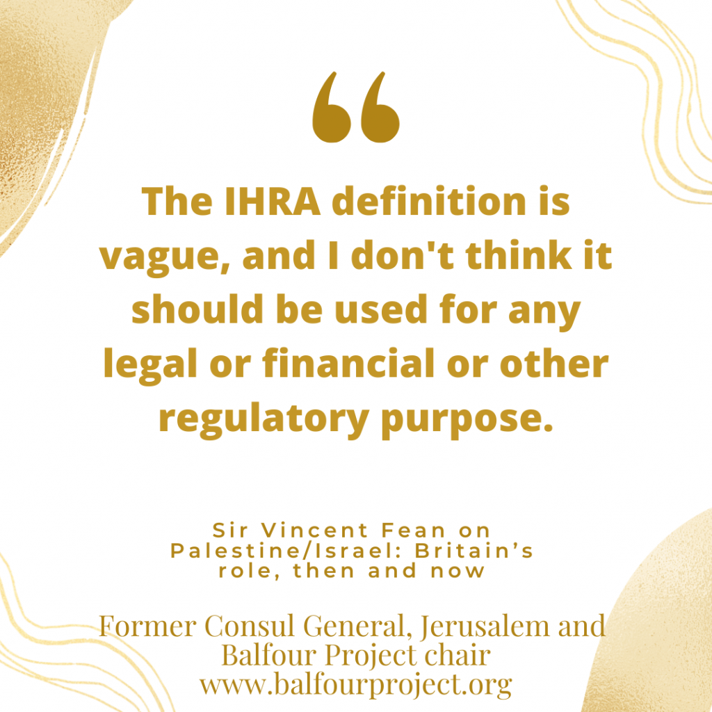 Another good thing happened: the Jerusalem Declaration on Anti-Semitism, signed by eminent Jewish lawyers and academics. It is a clearer, more precise definition than the one put together by the International Holocaust Remembrance Alliance, the IHRA, which should never be used for regulatory purposes, and should never have been put to that use. The Balfour Project strongly commends the Jerusalem Declaration on Anti-Semitism.