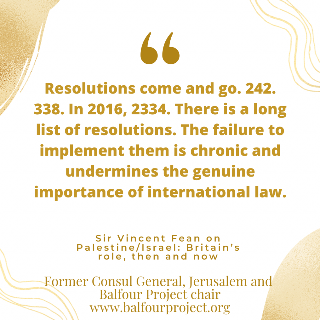 Resolutions come and go. 242. 338. In 2016, 2334. There is a long list of resolutions. The failure to implement them is chronic and undermines the genuine importance of international law, which was the focus of the latest Balfour Project Conference in May this year. More on that later.