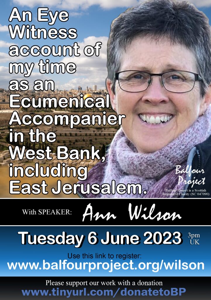 Ann Wilson (ex CAFOD employee in the Diocese of Salford and previous chaplain of Loreto College, Manchester) returned from monitoring human rights violations and breaches of international humanitarian law in East Jerusalem and other parts of the West Bank in November 2022. She spent 3 months on the EAPPI programme which is The World Council of Churches’ Ecumenical Accompaniment Programme in Palestine and Israel (WCC-EAPPI). Ann provided an eye witness account of what she observed.